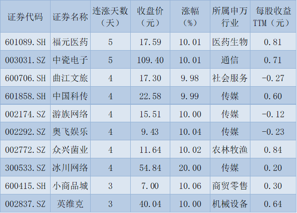 漲停股方面,今日有60只個股以漲停價報收,其中,有10只個股,股價已連續上漲超過3個交易日;跌停方面,有7只個股跌停價報收。從申萬一級行業看,傳媒漲停股數量居首,為16只,計算機和通信緊隨其后,漲停股數分別為10只和6只;跌停的7只個股分別涉及計算機、社會服務、煤炭、基礎化工、環保、傳媒等行業。