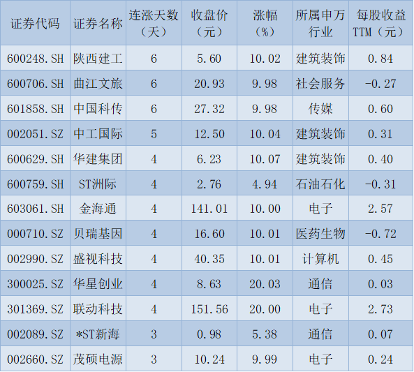 表:連續(xù)上漲2日且今日收盤漲停股一覽
