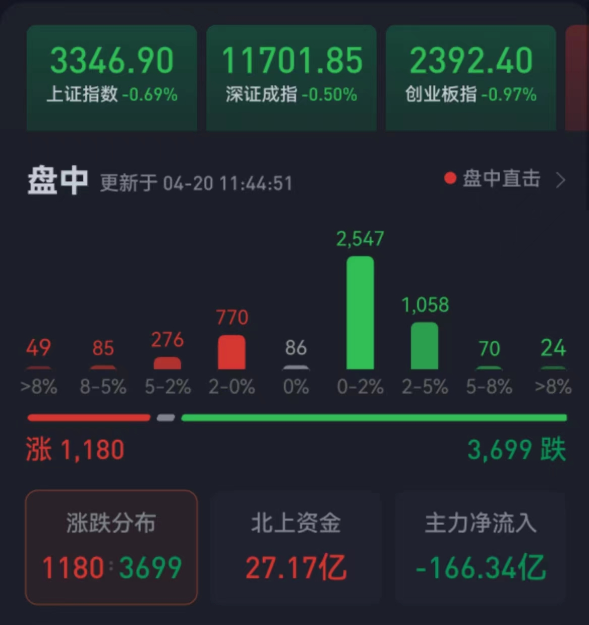 周四(4月20日),三大股指繼續(xù)震蕩整理,略有回落。截至上午收盤(pán),上證指數(shù)跌幅達(dá)0.69%,報(bào)3346.90點(diǎn);深證成指和創(chuàng)業(yè)板指跌幅分別為0.50%和0.97%;值得關(guān)注的是,科創(chuàng)50逆市大漲2.08%,滬深兩市合計(jì)成交額6866.3億元,總體來(lái)看,兩市個(gè)股跌多漲少。
