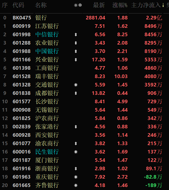 從早盤表現強勢的銀行行業看,交易中的42只成份股全線上漲,其中,有3只個股漲幅超5%。資金方面,有2.29億元大單資金凈流入該行業,居各行業第2位。