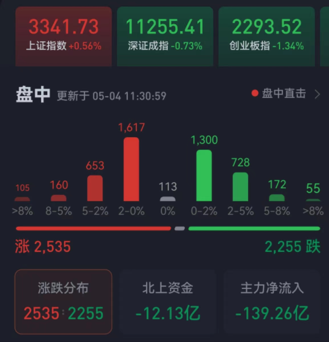 周四(5月4日),三大股指震蕩分化,漲跌不一。截至上午收盤,上證指數漲幅達0.56%,報3341.73點;深證成指和創業板指跌幅分別為0.73%和1.34%;滬深兩市合計成交額7732.0億元,總體來看,兩市個股漲多跌少。