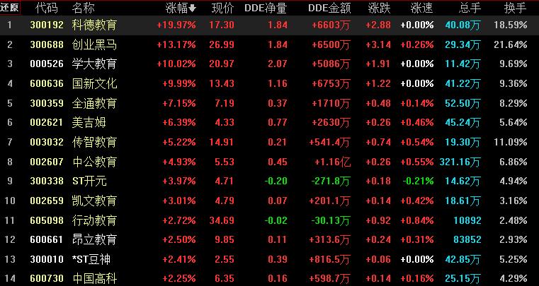 具體看,截至5月5日上午收盤,教育板塊漲幅居首達4.89%。其中,科德教育20CM漲停,創業黑馬、學大教育、國新文化等多只概念股漲幅均超9%。