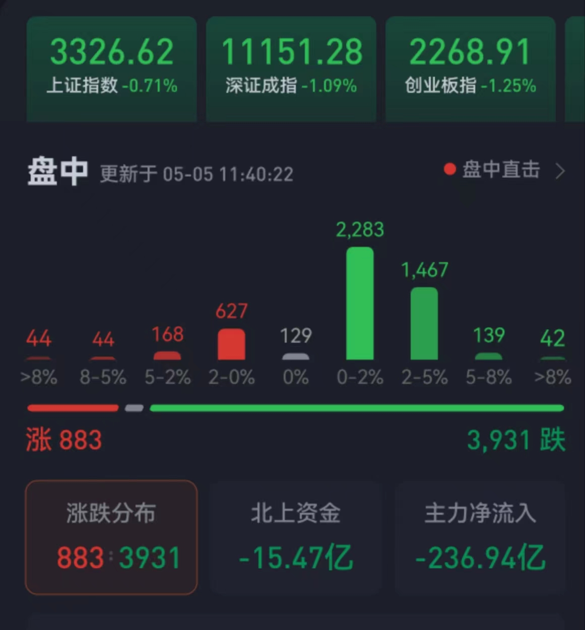 周五(5月5日),三大股指震蕩回落。截至上午收盤,上證指數跌幅達0.71%,報3326.62點;深證成指和創業板指跌幅分別為1.09%和1.25%;滬深兩市合計成交額7222.9億元,總體來看,兩市個股跌多漲少。