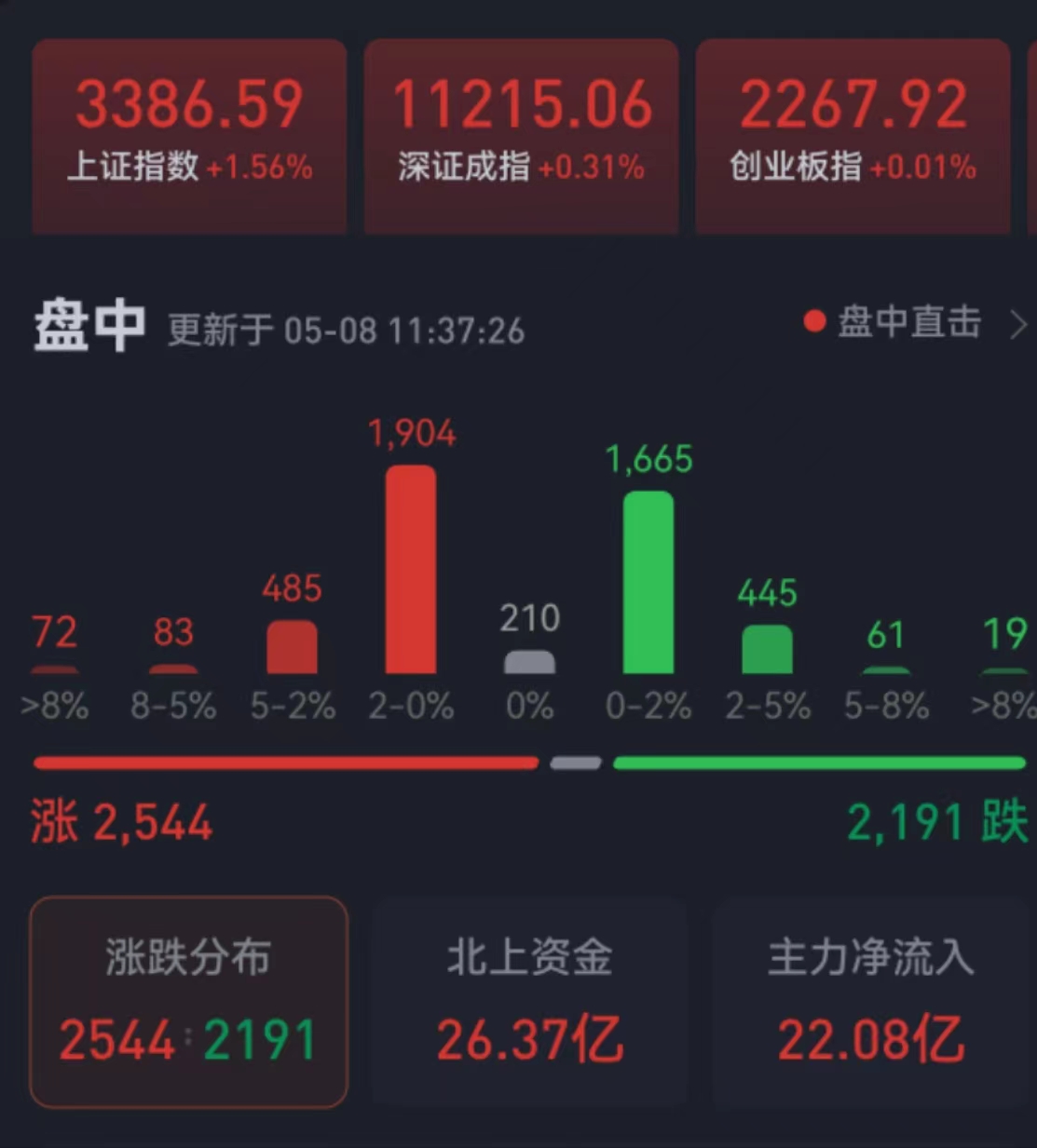 周一(5月8日),三大股指震蕩攀升,全線飄紅。截至上午收盤,上證指數漲幅達1.56%,報3386.59點;深證成指和創業板指漲幅分別為0.31%和0.01%;滬深兩市合計成交額7383.6億元,總體來看,兩市個股漲多跌少。
