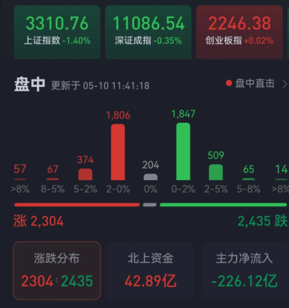 周三(5月10日),A股三大股指震蕩分化,漲跌不一。截至上午收盤,上證指數跌幅達1.40%,報3310.76點;深證成指跌幅達0.35%,創業板指漲幅為0.02%;滬深兩市合計成交額6453.2億元,總體來看,兩市個股跌多漲少。
