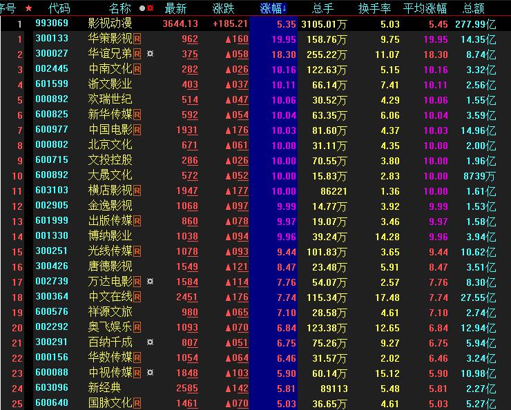 具體看,截至5月11日上午收盤,影視動漫板塊漲幅居首達5.35%,掀起漲停潮。其中,包括華策影視、中南文化、新華傳媒、歡瑞世紀、中國電影、出版?zhèn)髅健M店影視等在內(nèi)的超10只概念股集體漲停。