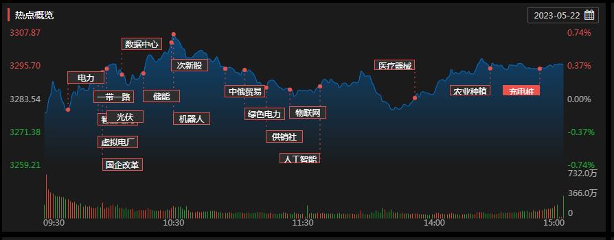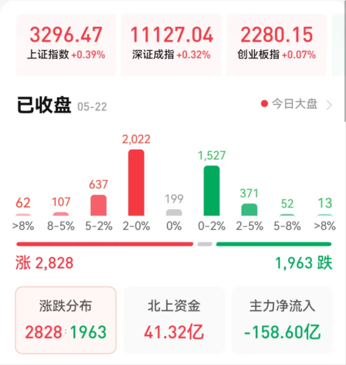 周一(5月22日),A股三大股指震蕩上行,全線飄紅。截至收盤,上證指數(shù)漲0.39%報3296.47點,深證成指漲0.32%報11127.04點,創(chuàng)業(yè)板指微漲0.07%報2280.15點;兩市合計成交金額7954億元。今日,北向資金合計凈買入金額41.32億元,此前連續(xù)2日凈賣出。其中,滬股通凈買入34.69億元,深股通凈買入6.63億元。總體上看,兩市個股漲多跌少。其中,漲停個股達(dá)52只,跌停個股達(dá)23只。