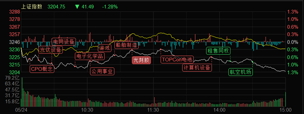 5月24日,A股三大指數(shù)集體收跌,深證成指和創(chuàng)業(yè)板指表現(xiàn)相對(duì)較強(qiáng),盤中一度紅盤,滬指則全天處于下跌狀態(tài),臨近3200點(diǎn)整數(shù)關(guān)口,并在全天最低點(diǎn)附近報(bào)收。截至收盤,上證指數(shù)跌1.28%報(bào)3204.75點(diǎn);深證成指跌0.84%報(bào)10920.33點(diǎn),創(chuàng)業(yè)板指跌0.36%報(bào)2245.26點(diǎn),A股合計(jì)成交額8045.48億元,較前一交易日增長(zhǎng)4.79%;北向資金全天凈賣出44.82億元;其中滬股通凈賣出13.79億元,深股通凈賣出31.04億元。個(gè)股方面漲少跌多,有2043只上漲,2910只下跌。