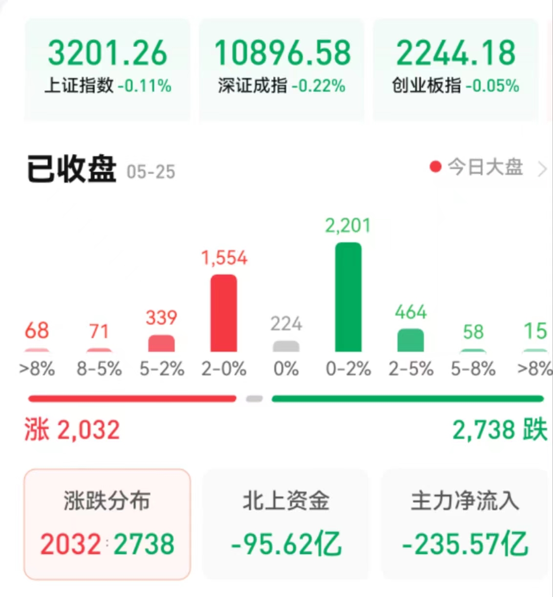 周四(5月25日),A股三大股指震蕩整理。截至收盤,上證指數跌0.11%報3201.26點,深證成指跌0.22%報10896.59點,創業板指微跌0.05%報2244.18點;兩市合計成交8569億元,北向資金凈賣出95.62億元。總體上看,兩市個股跌多漲少。其中,漲停個股達49只,跌停個股達36只。
