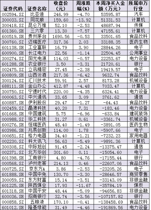資金方面,本周北向資金累計(jì)凈賣出金額達(dá)178.88億元,其中滬股通凈賣出58.88億元,深股通凈賣出120億元。從前十大成交活躍股來(lái)看,本周,比亞迪、同花順等2只個(gè)股,北向資金凈買入金額均超5億元。另外,隆基綠能、五糧液、招商銀行等個(gè)股遭北向資金凈賣出金額均超10億元。