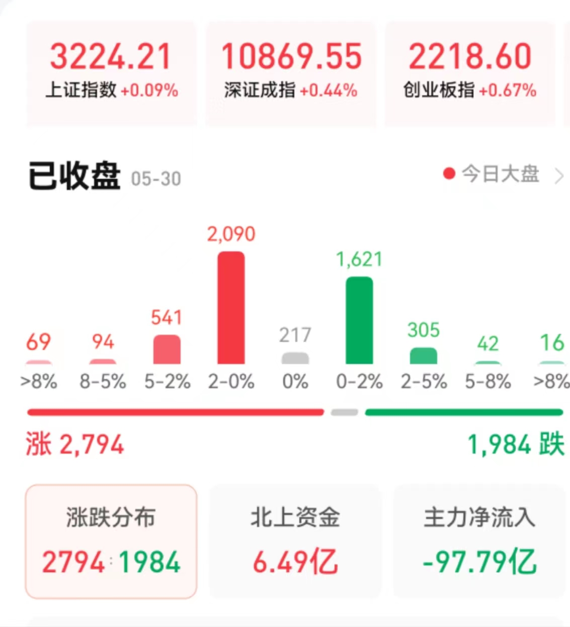 周二(5月30日),A股三大股指上演了V型反轉(zhuǎn)的走勢(shì),探底回升,全線(xiàn)翻紅。截至收盤(pán),上證指數(shù)微漲0.09%報(bào)3224.21點(diǎn),深證成指漲0.44%報(bào)10869.55點(diǎn),創(chuàng)業(yè)板指漲0.67%報(bào)2218.6點(diǎn);兩市合計(jì)成交金額達(dá)9332億元,北向資金凈買(mǎi)入6.49億元。總體上看,兩市個(gè)股漲多跌少。其中,漲停個(gè)股達(dá)51只,跌停個(gè)股達(dá)25只。