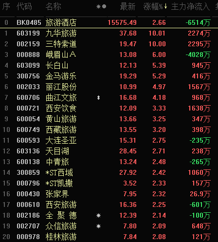 從早盤表現強勢的旅游酒店行業看,交易中的34只成份股中有31只上漲,其中,有5只個股漲幅超5%。資金方面,有6514萬元大單資金凈流出該行業。