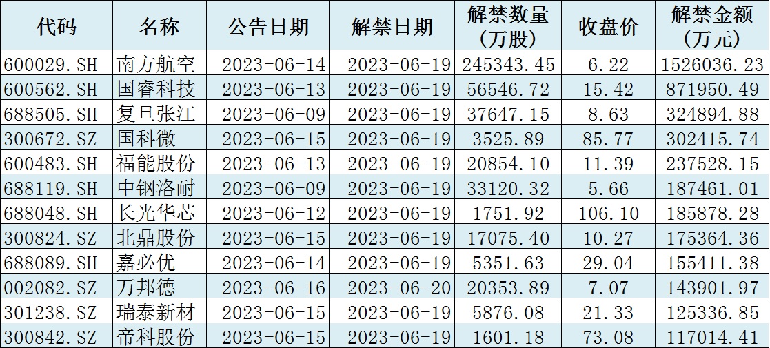 與此同時,據同花順統計顯示,下周(6月19日-23日)共有64家公司限售股陸續解禁,按最新收盤價計算,解禁市值為510.1億元。從解禁市值來看,南方航空(152.6億元)、國睿科技(87.2億元)等公司解禁金額均超80億元。