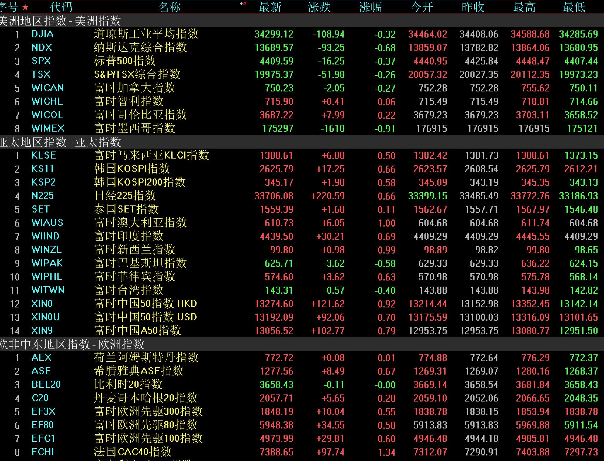 周五,美國三大股指全線收跌,道指跌0.32%報34299.12點,標普500指數跌0.37%報4409.59點,納指跌0.68%報13689.57點。本周,道指漲1.25%,標普500指數漲2.58%,納指漲3.25%。