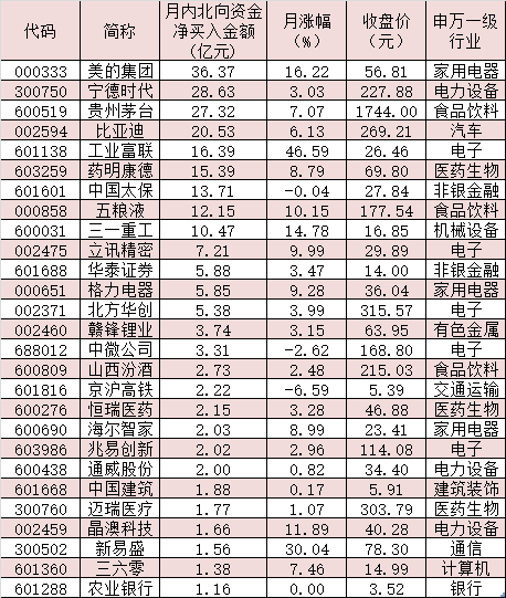 從行業來看,有10個申萬一級行業月內受到北向資金追捧,家用電器、食品飲料、電子、汽車等四行業月內北向資金凈買入額居前,均超20億元,月內北向資金合計凈買入額127.74億元。