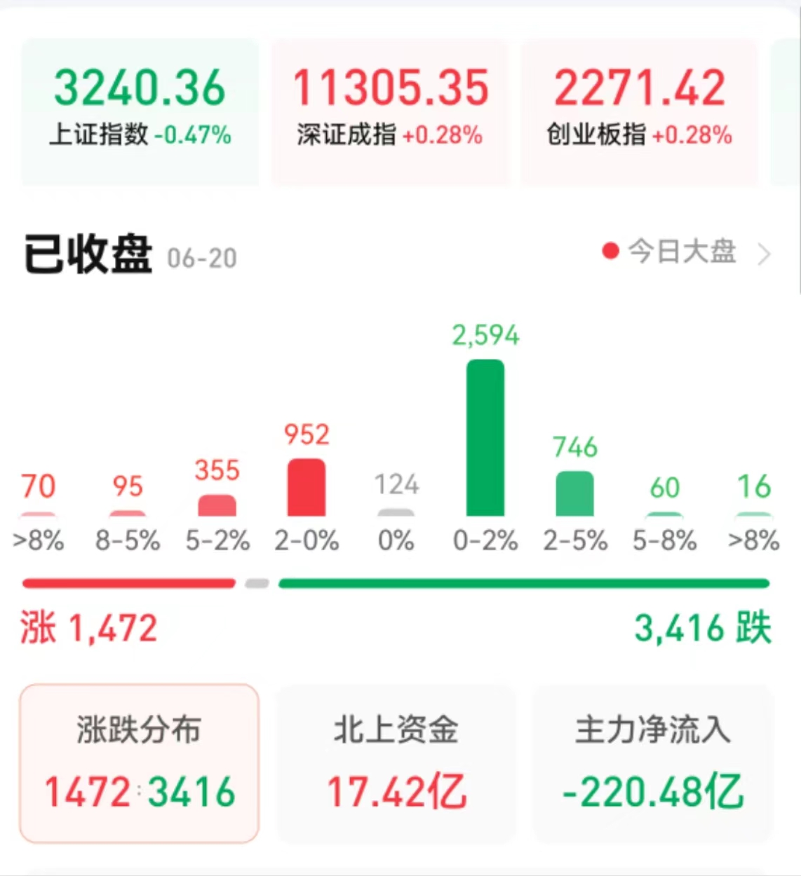 周二(6月20日),A股三大股指震蕩分化,漲跌不一。截至收盤,上證指數跌0.47%報3240.36點,深證成指漲0.28%,報11305.35點;創業板指漲0.28%,報2271.42點;兩市合計成交10900億元,連續第5個交易日突破萬億元;北向資金凈買入17.42億元;總體來看,A股個股跌多漲少。其中,漲停個股達42只,跌停個股達11只。