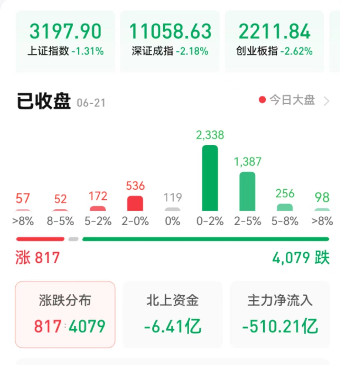 周三(6月21日),A股三大股指震蕩回落,全線飄綠。截至收盤,上證指數(shù)跌1.31%,報(bào)3197.9點(diǎn);深證成指跌2.18%,報(bào)11058.63點(diǎn);創(chuàng)業(yè)板指跌2.62%,報(bào)2211.84點(diǎn)。兩市合計(jì)成交金額10219億元,連續(xù)第6個(gè)交易日突破萬億元。北向資金凈賣出6.41億元。總體上看,兩市個(gè)股跌多漲少,超4000只個(gè)股下跌,其中,漲停個(gè)股達(dá)47只,跌停個(gè)股達(dá)20只。