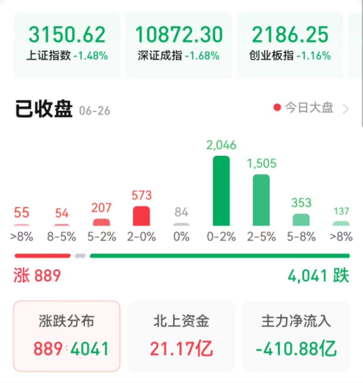 周一(6月26日),A股三大指數震蕩下行,全線下跌。截至收盤,上證指數跌1.48%報3150.62點,深證成指跌1.68%報10872.3點,創業板指跌1.16%報2186.25點;兩市合計成交額達9773億元,北向資金凈買入21.17億元。總體上看,兩市個股跌多漲少,下跌個股超4000只,其中,漲停個股達46只,跌停個股達31只。