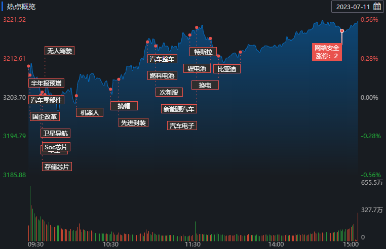 7月11日,A股三大指數(shù)高開震蕩走高,創(chuàng)業(yè)板指表現(xiàn)最強,中小盤股相對活躍。截至收盤,上證指數(shù)漲0.55%報3221.37點;深證成指漲0.78%報11028.68點,創(chuàng)業(yè)板指漲0.81%報2216.78點。A股合計成交額7746.91億元,較前一交易日增長1.54%;北向資金全天凈買入34.89億元;其中滬股通凈買入19.15億元,深股通凈買入15.74億元。今日A股有3573只上漲,1407只下跌。