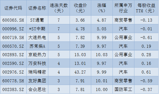 表:連續(xù)上漲3日且今日收盤漲停股一覽