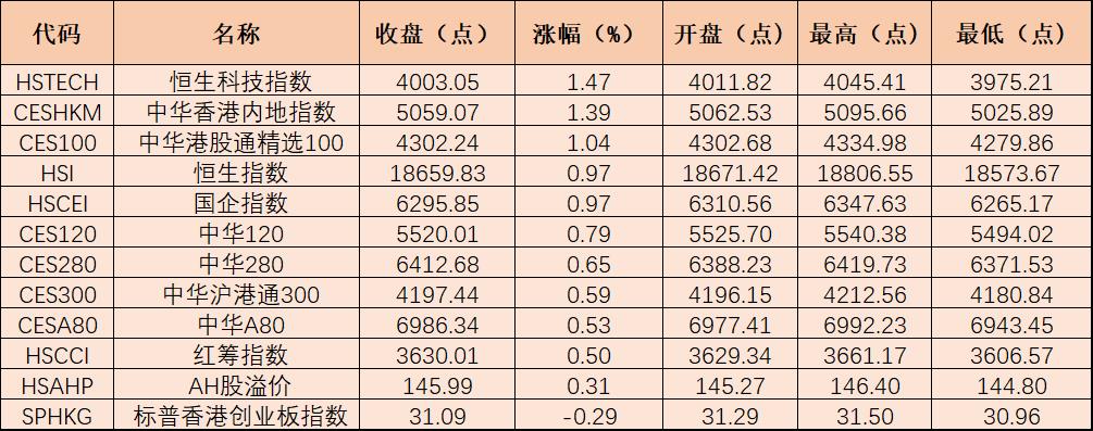 7月11日,港股市場指數普遍走強,截至收盤,恒生指數漲0.97%,報18659.83點;恒生科技指數漲1.47%,報4003.05點,兩大指數均為連續第2個交易日實現上漲。