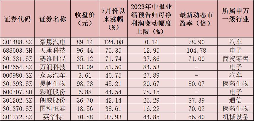 表:7月份以來漲幅居前十的業績預計增長公司一覽