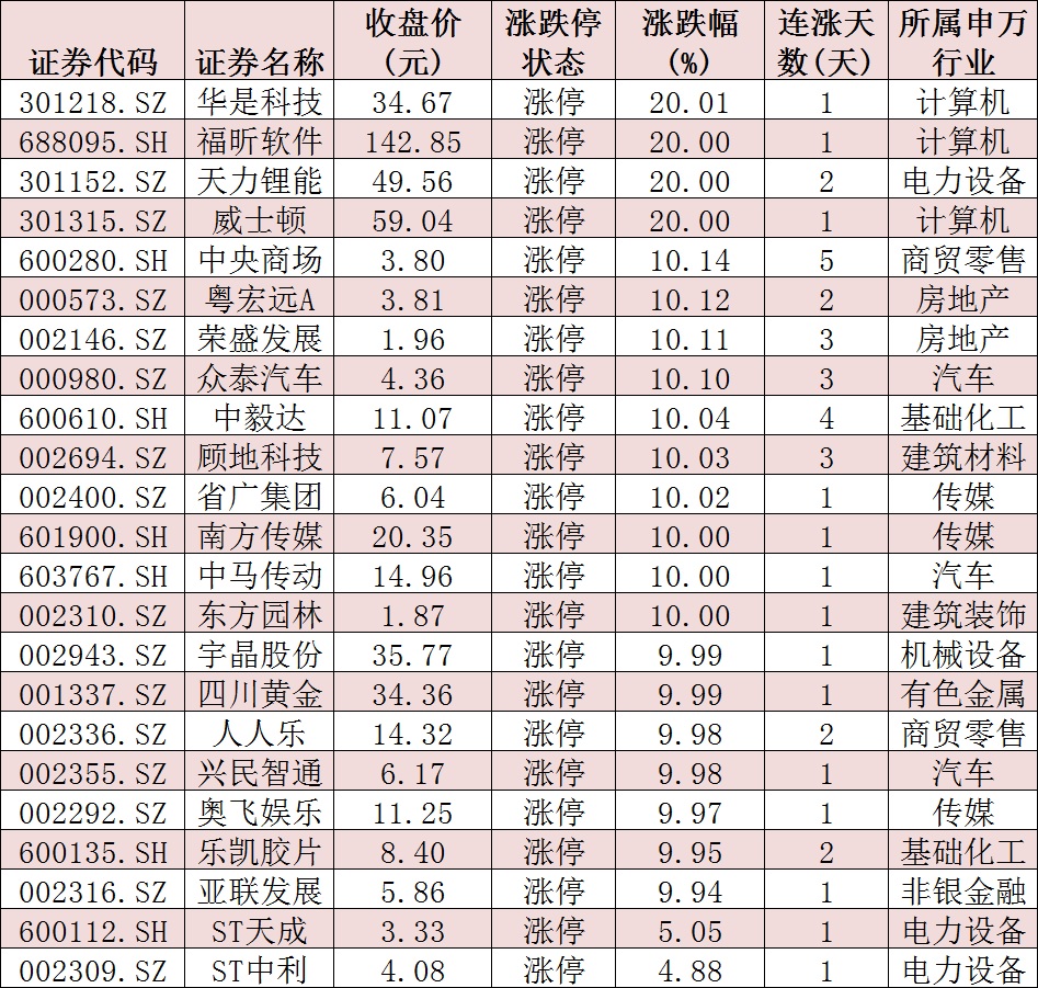 具體來看,今日,貴金屬板塊領漲,四川黃金漲停;空間計算概念股盤中拉升,華是科技漲停;房地產板塊午后走強,粵宏遠A、榮盛發展漲停;零售板塊持續活躍,中央商場4連板,人人樂漲停;傳媒板塊盤中異動,南方傳媒等3只個股漲停;ERP概念、空間計算、黃金概念、汽車拆解概念、房地產服務等板塊表現活躍。金屬新材料板塊領跌,胎壓監測、3D打印、高壓快充、自動化設備、國防軍工、OLED、存儲芯片等板塊跌幅居前。