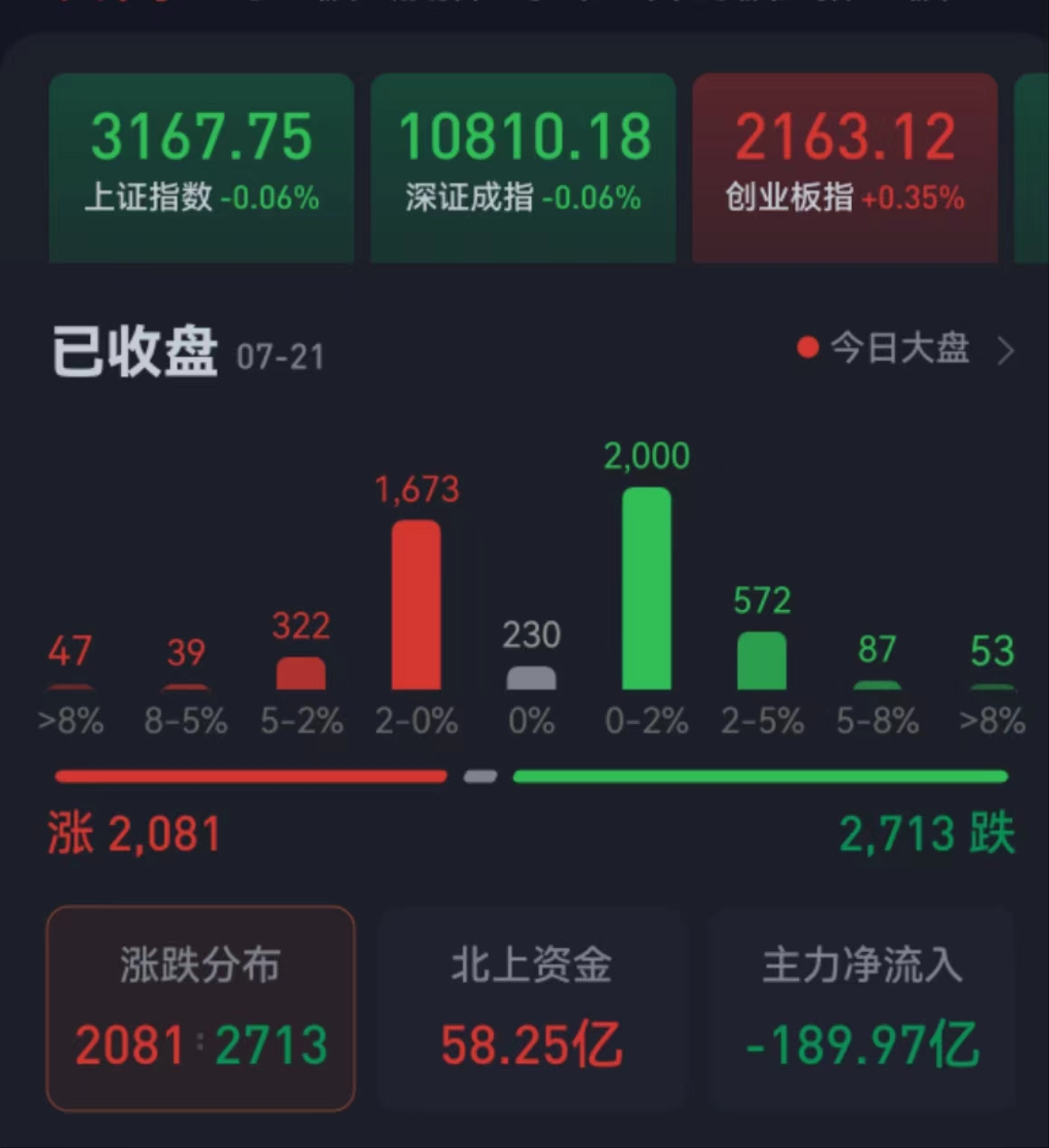 周五(7月21日),A股三大股指震蕩分化,漲跌不一。截至收盤,上證指數微跌0.06%報3167.75點,深證成指跌0.06%報10810.18點,創業板指漲0.35%報2163.12點;兩市合計成交7109.57億元,北向資金凈買入58.25億元,其中,滬股通凈買入39.93億元,深股通凈買入18.32億元。本周北向資金累計凈賣出75.25億元??傮w上看,兩市個股跌多漲少。其中,漲停個股達35只,跌停個股達16只。