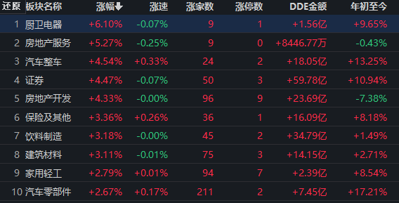 從早盤表現強勢的廚衛電器行業看,交易中的9只成份股全線上漲,其中,有3只個股漲幅超5%。