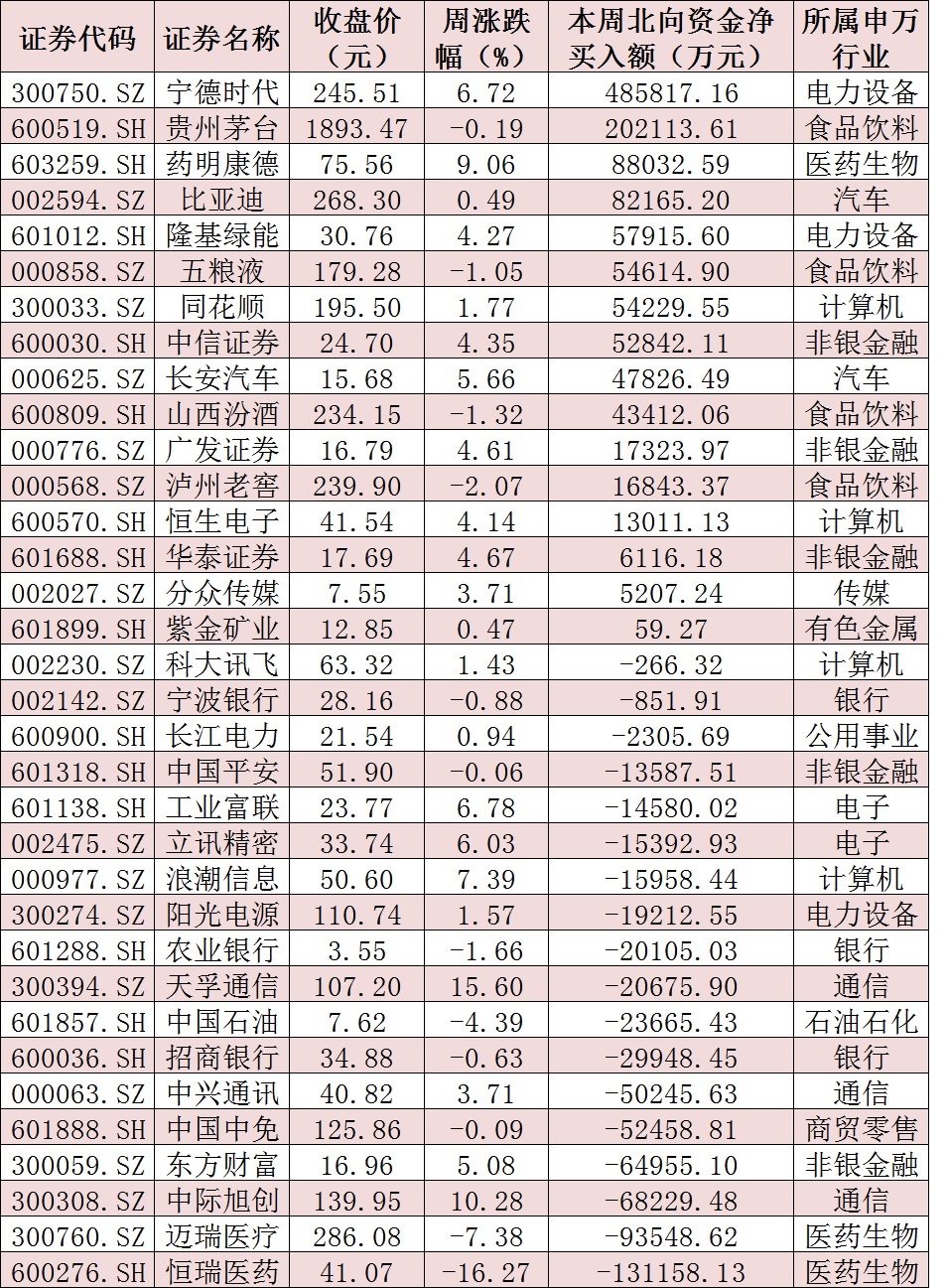 表:本周滬、深股通前十大成交活躍股交易情況: