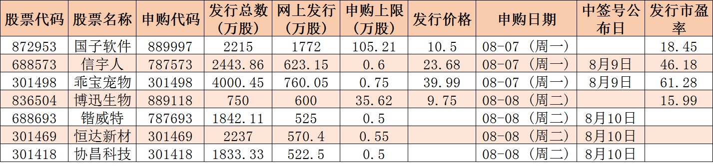 根據發行安排,下周(8月7日-11日)有7只新股發行,其中,創業板3只,科創板2只,北交所2只。具體安排如下,8月7日發行的是信宇人、乖寶寵物、國子軟件;8月8日發行的是協昌科技、鍇威特、恒達新材、博迅生物。
