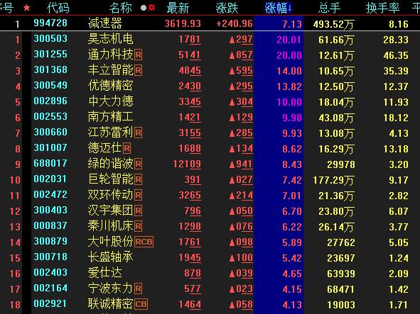 具體看,截至8月17日上午收盤,減速器板塊漲幅居首,達7.13%。其中,昊志機電、通力科技等概念股20CM漲停。