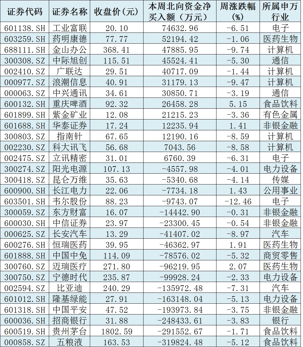 資金方面,周五,北向資金凈賣出85.22億元,已連續10個交易日凈賣出,創歷史最長連續凈賣出天數紀錄。本周北向資金累計凈賣出金額達291.16億元。從前十大成交活躍股來看,本周,工業富聯、藥明康德等2只個股,北向資金凈買入金額均超5億元。另外,五糧液、貴州茅臺、招商銀行等3個股遭北向資金凈賣出金額均超20億元。