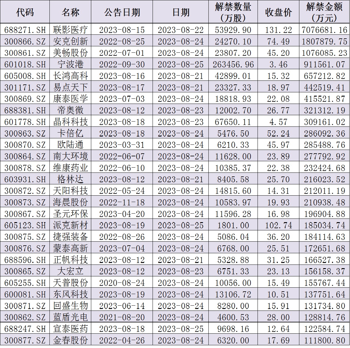 與此同時,據同花順統計,下周(8月21日-25日)共有69家公司限售股陸續解禁,按最新收盤價計算,解禁市值為1740.02億元。從解禁市值來看,聯影醫療(707.67億元)、安克創新(180.79億元)、美暢股份(107.61億元)等公司解禁金額均超100億元。