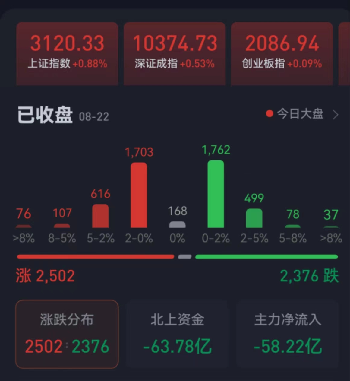 周二(8月22日),A股三大股指震蕩上行,全線(xiàn)飄紅。截至收盤(pán),上證指數(shù)漲0.88%報(bào)3120.33點(diǎn),深證成指漲0.53%報(bào)10374.73點(diǎn),創(chuàng)業(yè)板指微漲0.09%報(bào)2086.94點(diǎn);兩市量能有所放大,合計(jì)成交金額達(dá)8183.8億元,北向資金凈賣(mài)出63.78億元。總體上看,兩市個(gè)股漲多跌少,上漲個(gè)股2502只,略多于下跌個(gè)股。其中,漲停個(gè)股達(dá)45只,跌停個(gè)股達(dá)14只。