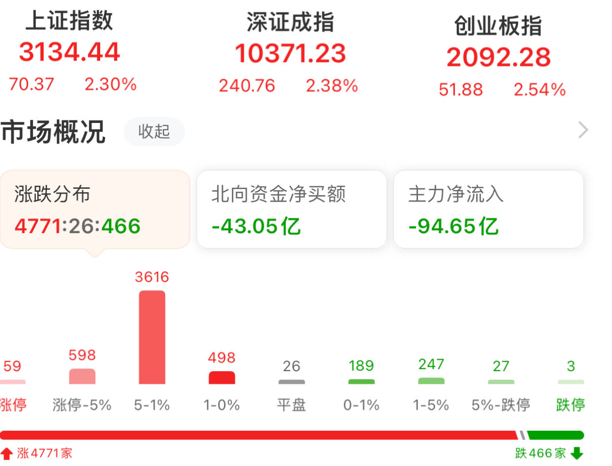周一(8月28日),三大股指集體大漲。截至上午收盤,上證指數漲2.3%,報3134.44點;深證成指和創業板指分別漲2.38%和2.54%;滬深兩市合計成交額7776.23億元,總體來看,兩市個股漲多跌少,4771只個股上漲,466只個股下跌。其中,59只個股漲停,3只個股跌停。