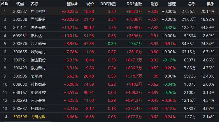 具體看,截至9月5日上午收盤,光刻膠板塊漲幅居首,達3.22%。其中,廣信材料、同益股份等概念股均20CM漲停。