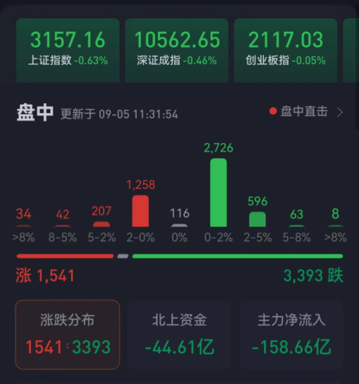 周二(9月5日),三大股指震蕩回落。截至上午收盤,上證指數跌幅達0.63%,報3157.16點;深證成指和創業板指跌幅分別為0.46%和0.05%;滬深兩市合計成交額5235.7億元,總體來看,兩市個股跌多漲少,近3400只個股下跌。