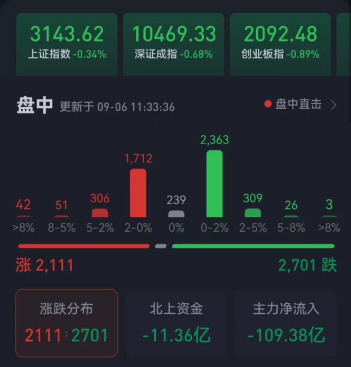 周三(9月6日),三大股指繼續(xù)震蕩整理。截至上午收盤,上證指數(shù)跌幅達(dá)0.34%,報(bào)3143.62點(diǎn);深證成指和創(chuàng)業(yè)板指跌幅分別為0.68%和0.89%;滬深兩市合計(jì)成交額4356.6億元,總體來看,兩市個股跌多漲少。其中,29只個股漲停,1只個股跌停。