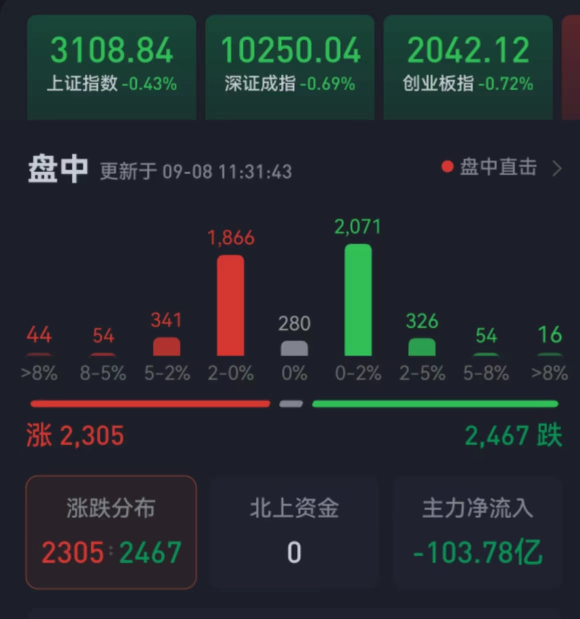 周五(9月8日),三大股指繼續震蕩回落。截至上午收盤,上證指數跌幅達0.43%,報3108.84點;深證成指和創業板指跌幅分別為0.69%和0.72%;滬深兩市合計成交額4050.6億元,總體來看,兩市個股跌多漲少。