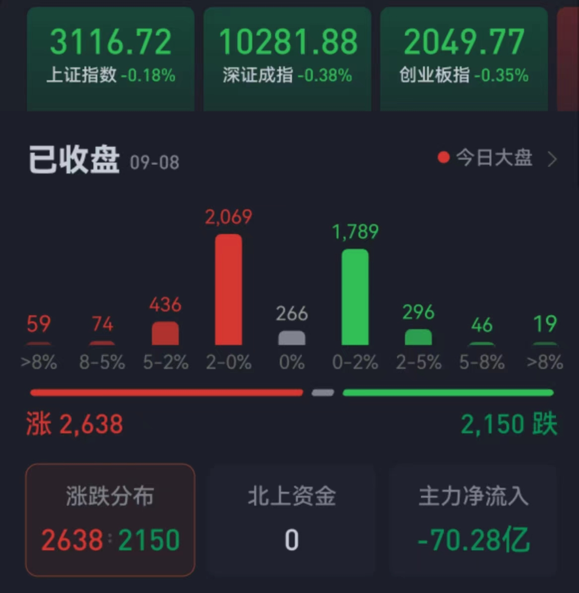 周五(9月8日),A股三大股指震蕩整理。截至收盤,上證指數跌0.18%報3116.72點,深證成指跌0.38%報10281.88點,創業板指跌0.35%報2049.76點;兩市合計成交金額6818.1億元。總體上看,兩市個股漲多跌少。其中,漲停個股達44只,跌停個股達5只。