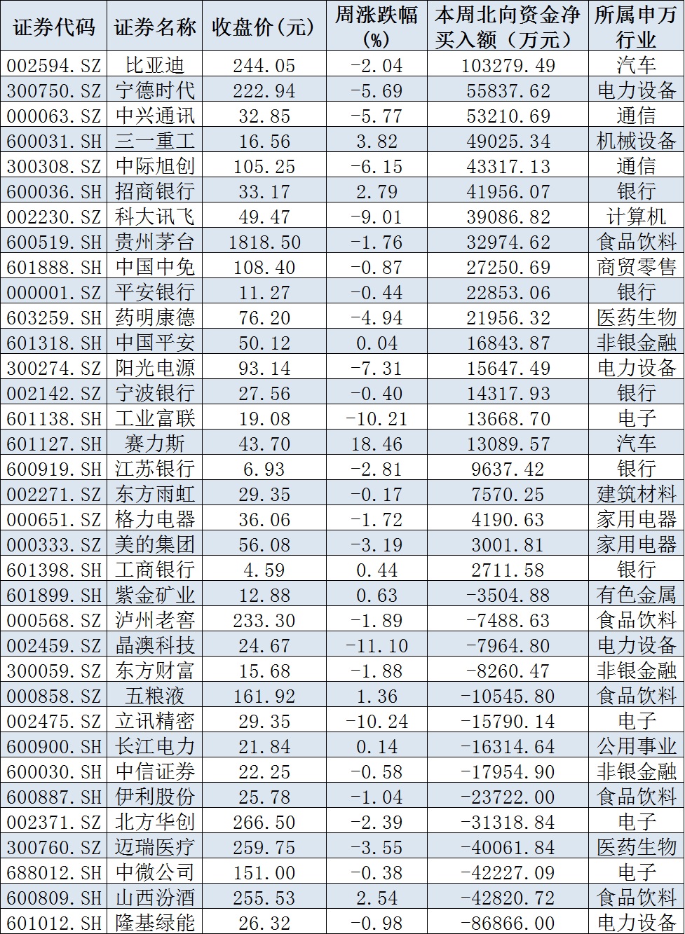 本周,資金方面,北向資金累計凈賣出金額達47.56億元。從前十大成交活躍股來看,比亞迪、寧德時代、中興通訊等3只個股北向資金凈買入金額均超5億元。另外,隆基綠能、山西汾酒、中微公司、邁瑞醫療等個股遭北向資金凈賣出金額均超4億元。