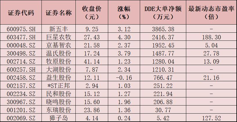表:9月12日獲大單資金凈買入的養殖業個股一覽