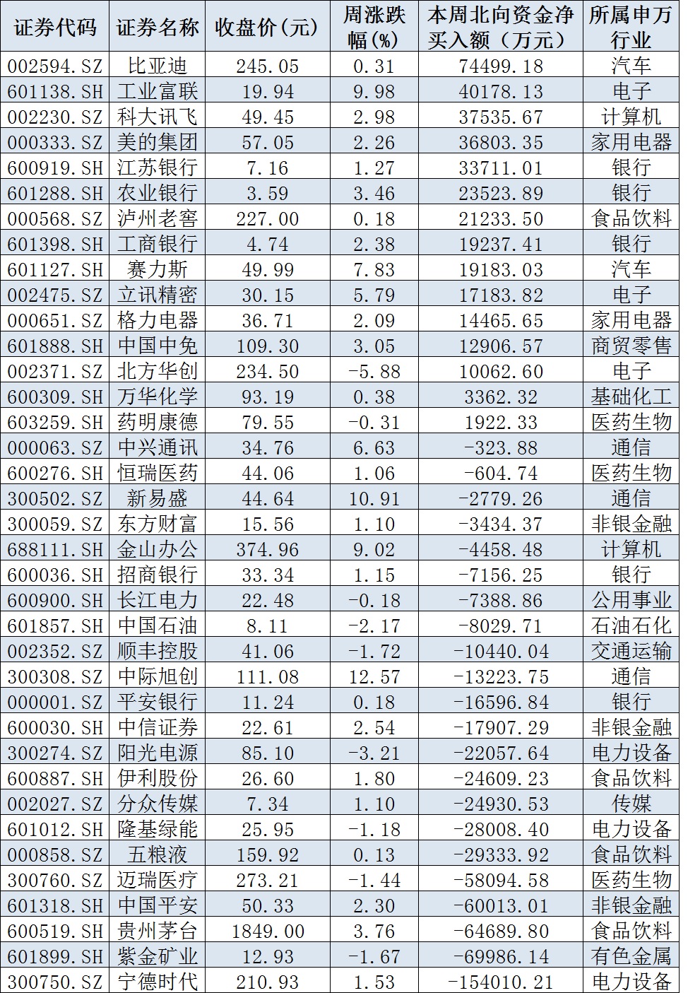 資金方面,本周北向資金累計凈買入金額達0.29億元,結束連續六周的凈流出,其中,滬股通凈流出4.4億元,深股通凈流入4.69億元。從前十大成交活躍股來看,本周,比亞迪、工業富聯等兩只個股,北向資金凈買入金額均超4億元。另外,寧德時代、紫金礦業、貴州茅臺、中國平安等個股遭北向資金凈賣出金額均超6億元。