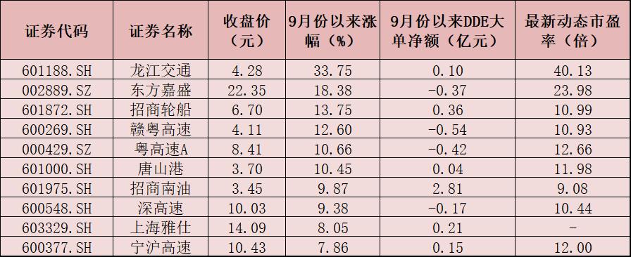 表:9月份以來漲幅居前十的交通運輸股一覽