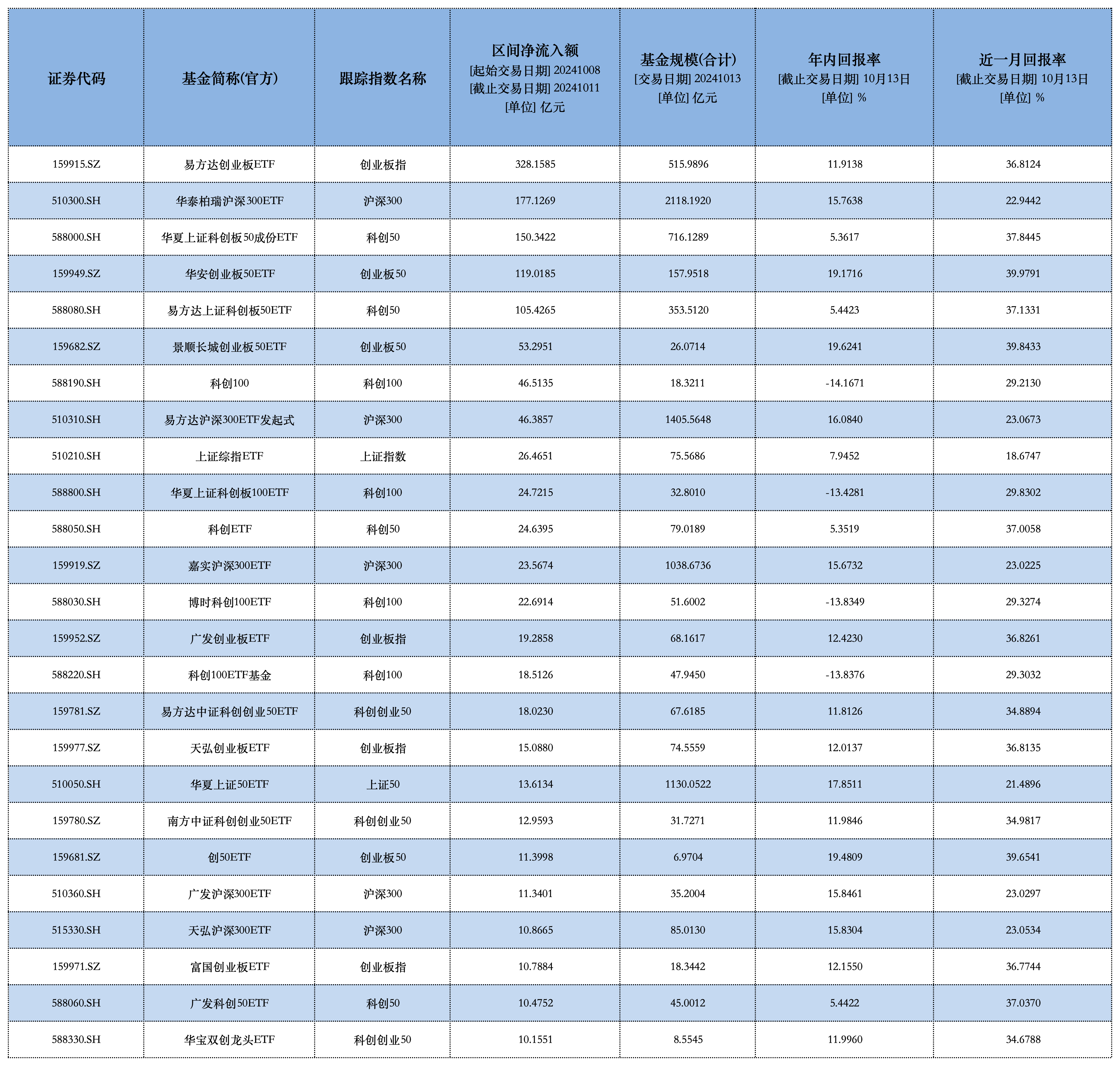 易方達(dá)創(chuàng)業(yè)板ETF(159915)、華泰柏瑞滬深300ETF(510300)、華夏上證科創(chuàng)板50成份ETF(588000)、華安創(chuàng)業(yè)板50ETF(159949)、易方達(dá)上證科創(chuàng)板50ETF(588080)等5只寬基ETF凈流入額均超100億元,分別為328.16億元、177.13億元、150.34億元、119.02億元、105.43億元。