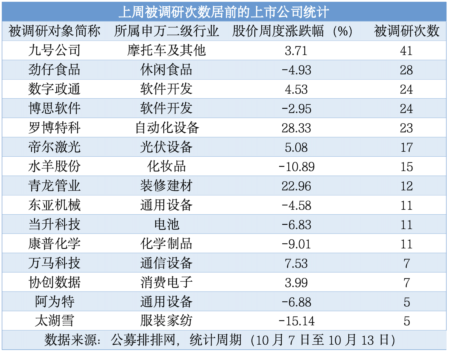 其中,九號公司被公募機構調研41次居首,該公司產品涵蓋智能電動平衡車、電動滑板車、電動兩輪車以及智能割草機器人等短交通和機器人產品。該公司在2024年上半年的營收同比增長了52.20%,凈利潤同比增長了167.82%。另外,勁仔食品、博思軟件、數字政通、羅博特科等4家公司上周被調研次數居前,均被調研不少于20次。