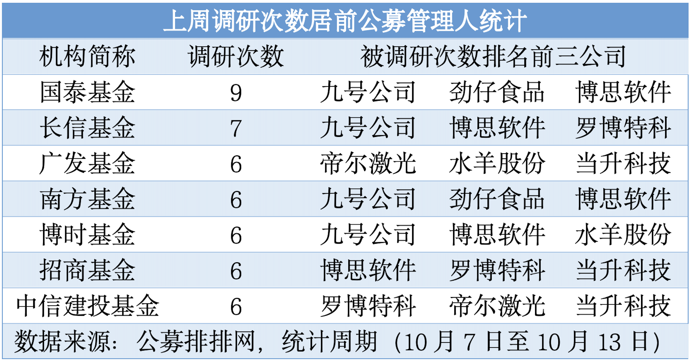 上周參與上市公司調研的107家公募機構中,67家公募機構調研次數不少于2次,其中51家調研2次至4次;16家調研不少于6次。其中,國泰基金上周調研9次居首。此外,長信基金、廣發基金、南方基金、博時基金、招商基金、中信建投基金等公募調研次數靠前,均調研不少于6次。
