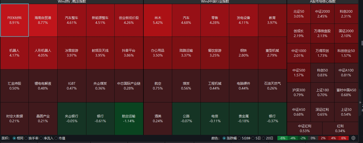 從板塊來看,PEEK材料、海南自貿區、汽車整車、新能源整車、創業板低價股等板塊漲幅居前。其中,PEEK材料、海南自貿區、汽車整車、新能源整車全線飄紅,樣本股均上揚。以PEEK材料為例,富恒新材、新瀚新材、肇民科技、華密新材和中欣氟材漲幅均在10%以上。
