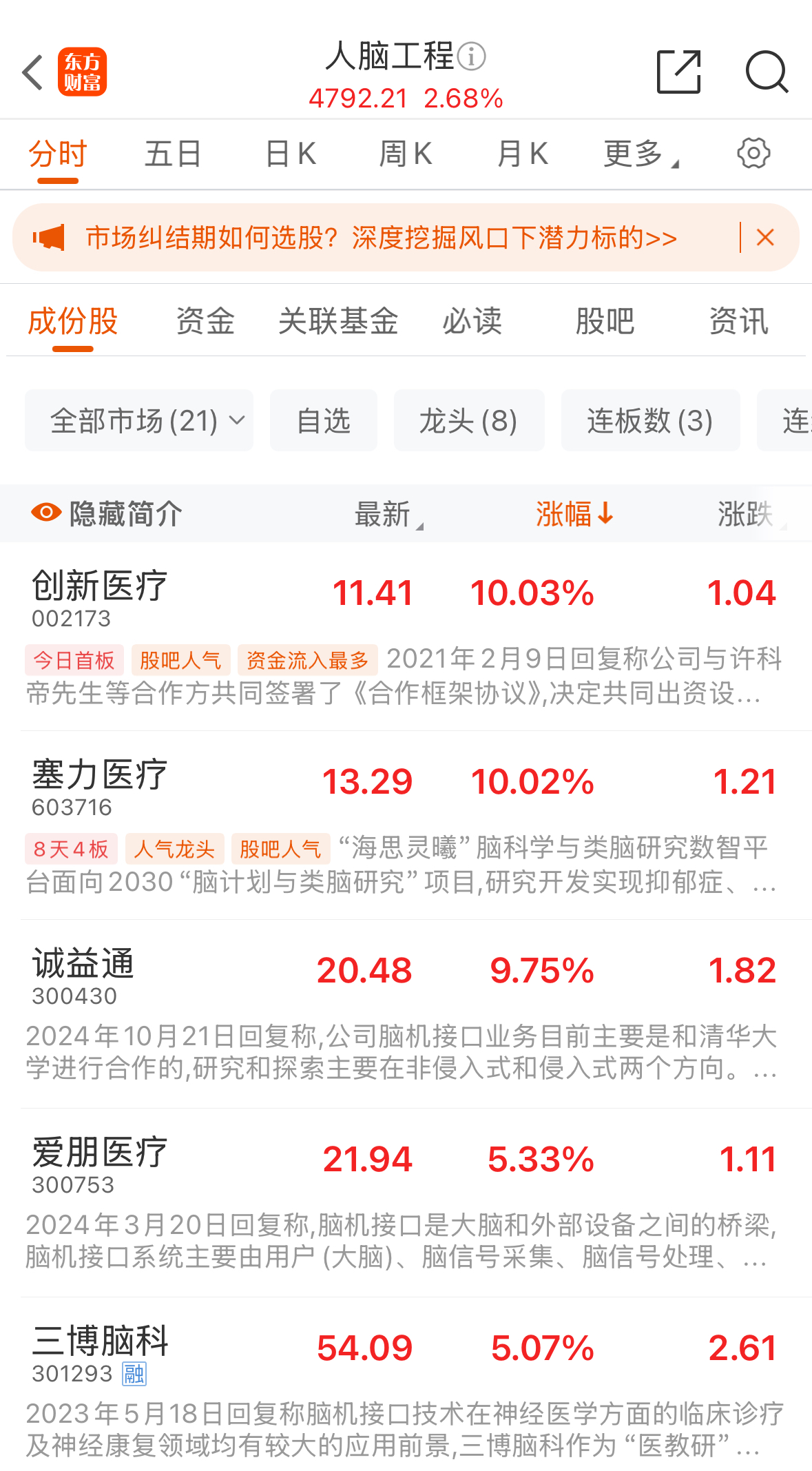 3月12日午后,人腦工程概念股異動拉升,截至當(dāng)日收盤,人腦工程概念股整體指數(shù)漲幅達(dá)2.68%,成份股中,創(chuàng)新醫(yī)療管理股份有限公司(簡稱“創(chuàng)新醫(yī)療”)、塞力斯醫(yī)療科技集團(tuán)股份有限公司(簡稱“塞力醫(yī)療”)兩只個股漲停,北京誠益通控制技術(shù)集團(tuán)股份有限公司(簡稱“誠益通”)大漲9.75%,三博腦科醫(yī)院管理集團(tuán)股份有限公司(簡稱“三博腦科”)、江蘇愛朋醫(yī)療科技股份有限公司(簡稱“愛朋醫(yī)療”)漲超5%。